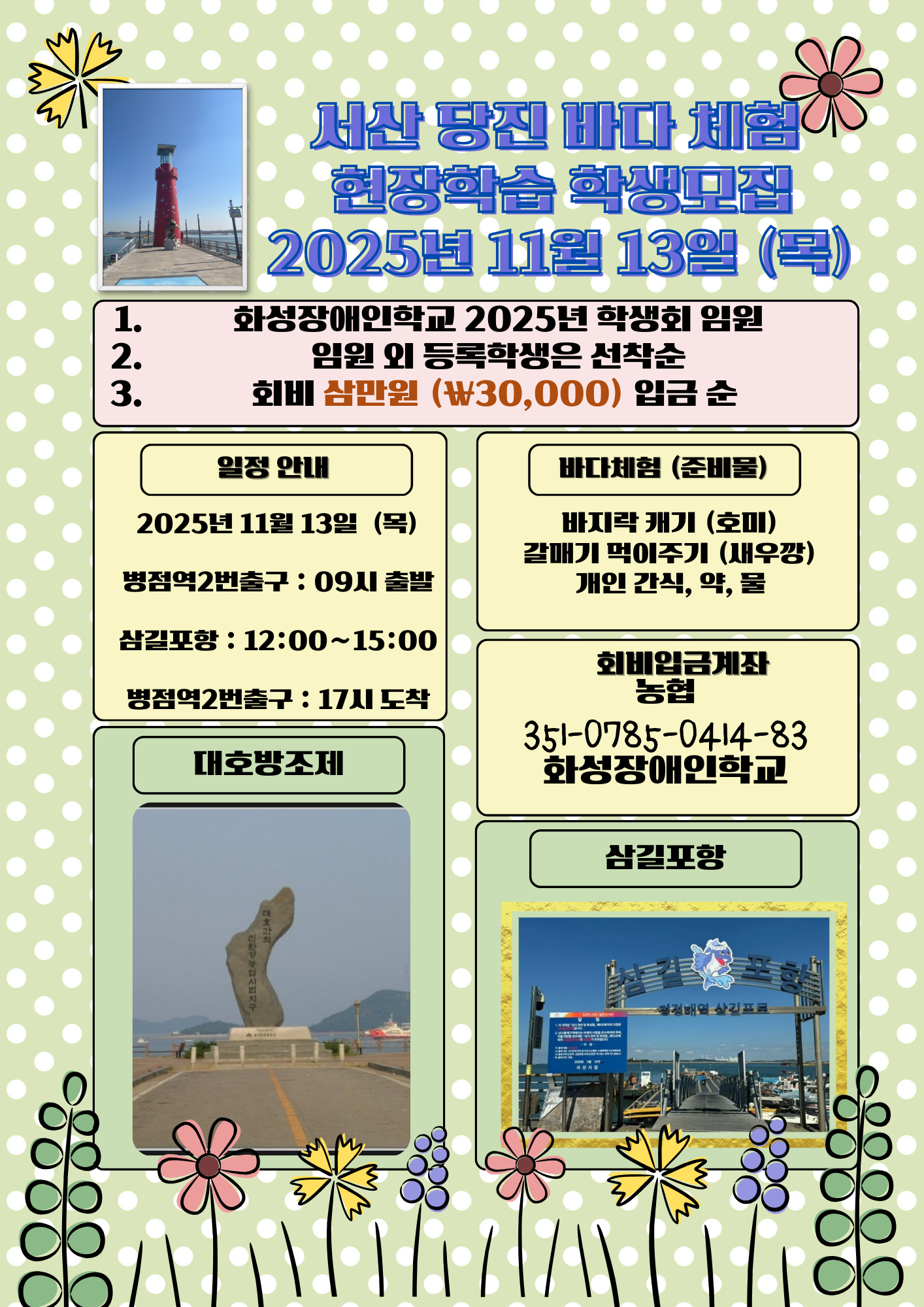 서산 당진 바다 체험 현장학습 안내 작성자화성장애인야학|작성시간25.09.08|조회수23 목록 댓글 1 글자크기 작게가 글자크기 크게가 2025년 11월 13일 목요일에 대호방조제 전망대와 삼길포항을 아르딤 동행버스를 타고 현장학습을 다녀오려고 합니다. 선착순이오니 학교의 단체카톡방을 참고바랍니다. 다음검색 현재 게시글 추가 기능 열기 북마크 공유하기 신고 센터로 신고 댓글 댓글 1 댓글쓰기 답글쓰기 댓글 리스트 작성자화성장애인야학 작성자 본인 여부 작성자 | 작성시간 25.09.09 총인원 28명 확정.휠체어이용 학생 7명 포함하여 학생 16명 실무자와 활동지원사 그리고 보호자 12명이 접수하여 여행 모집을 마감합니다. 감사드립니다.~.~ 댓글 전체보기