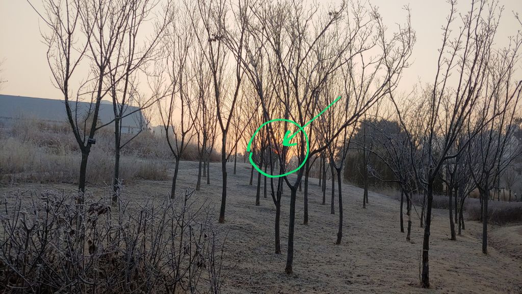 나무가지 사이로 보이는 일출이