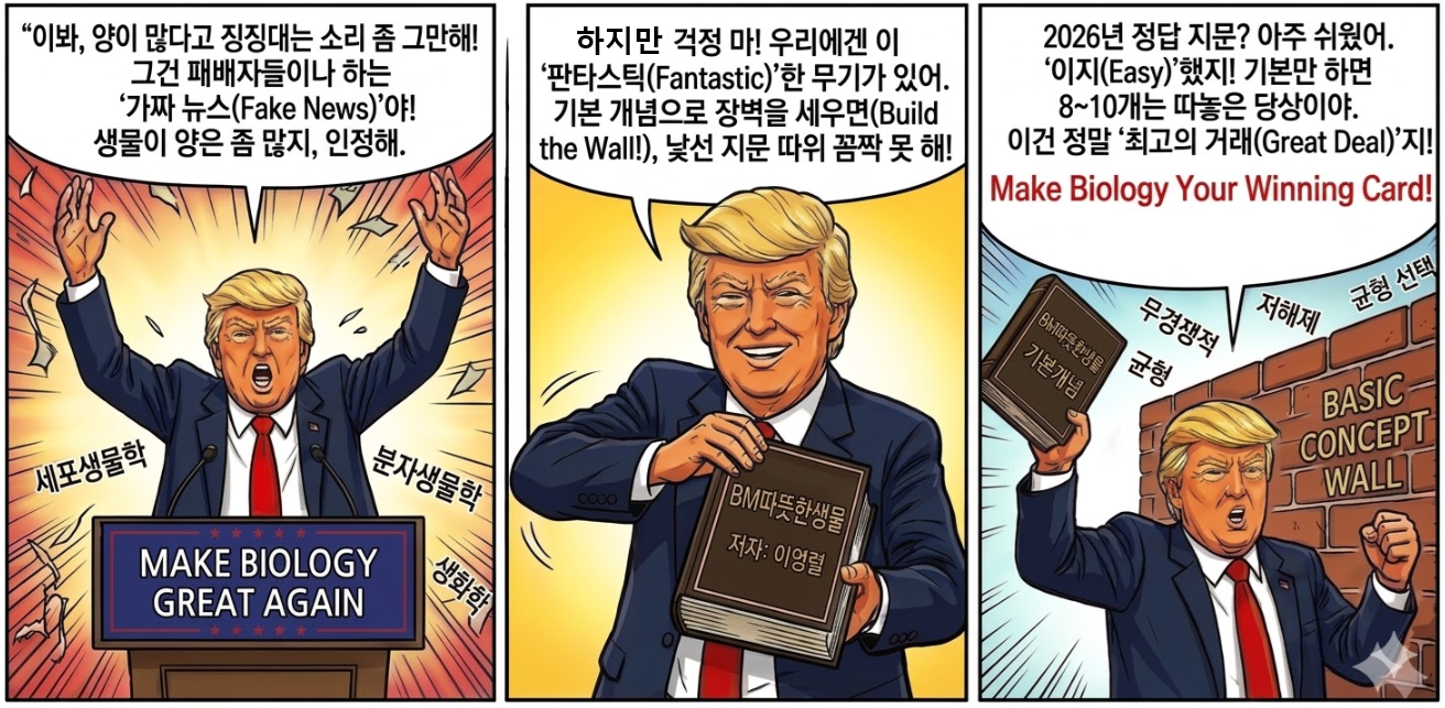 더 나아가 생물은 우리의 몸, 우리가 먹는 음식, 그리고 우리 주변의 자연과 직결된 학문입니다. 즉, 생물은 ‘남의 이야기’가 아니라 ‘우리 자신의 이야기’입니다. 이런 연관성을 인식하고 공부한다면 생물은 부담이 아니라 이해의 즐거움을 주는 과목이 됩니다. 그러므로 생물은 이해하고 연결하며 친근하게 접근하는 태도가 필요합니다.