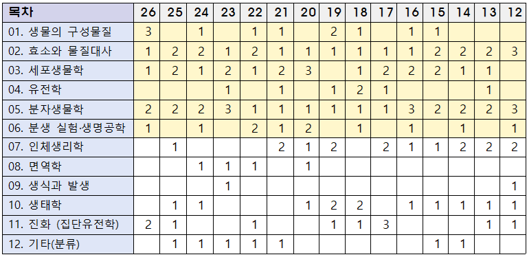 (2) (2025년도에 한 말 그대로 인용하자면) 생물에 양적 부담을 느껴 전략적 접근을 원하는 경우 전반부(1장∼6장) 위주로 회독해도 최소 5개 이상은 충분히 나올 수 있다고 판단됩니다만, 되도록 처음부터 끝까지 꾸준히 회독을 권하는 바입니다.