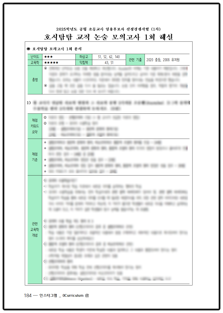 문제를 내는 것보다 해설을 잘 만드는 것이 훨씬 더 중요합니다. "호시탐탐 교직 논술 모의고사"의 해설은 아래의 세 가지에 중점을 두고 만들었습니다.