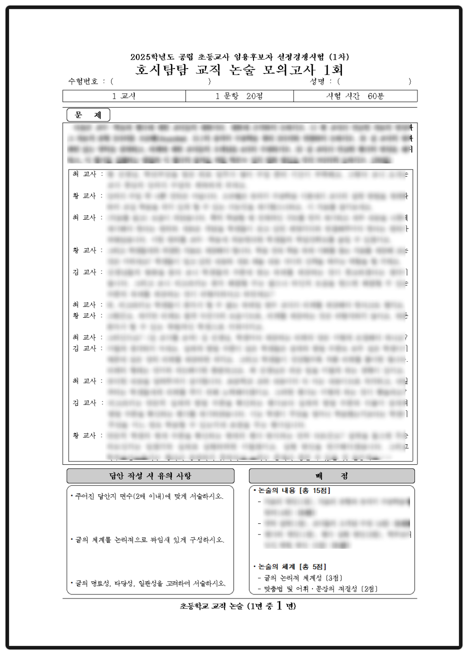 - "호시탐탐 교직 논술 모의고사"는 실제 기출문제의 양식으로 제작했습니다. 표, 글씨체 등 실전과 비슷한 문제 양식을 통해 선생님께서는 실전 감각을 기르실 수 있을 것입니다.