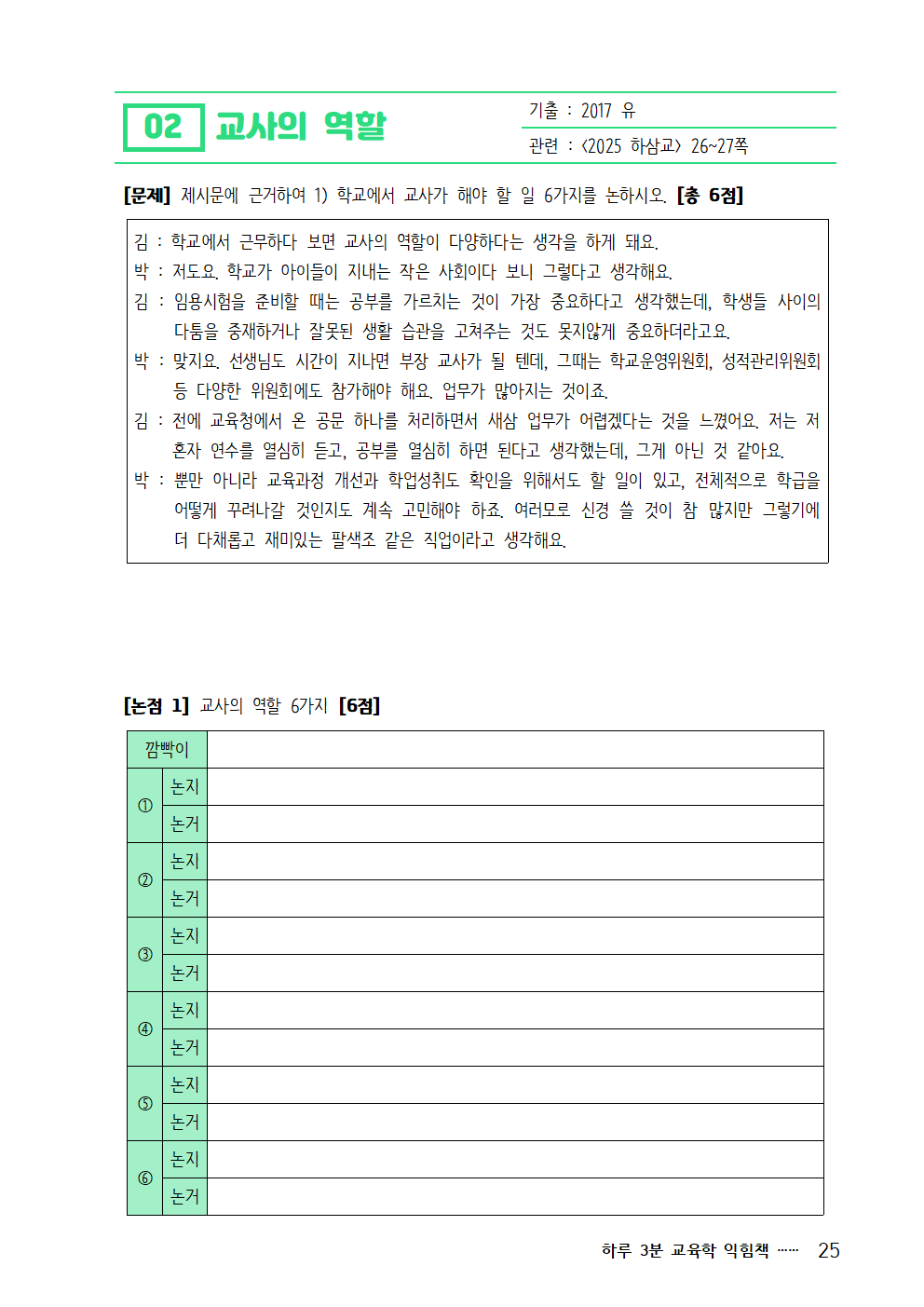 - <2025 익힘책> 문제 우측 상단에는 관련 기출문제의 출제 연도, <2025 하삼교>의 수록 페이지가 들어있습니다. 바로바로 찾아서 편리하게 공부하시면 됩니다.