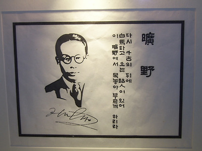 " 다시 천고(千古)의 뒤에 백마(白馬)타고 오는 초인(超人)이 있어 이 광야에서 목놓아 부르게 하리라. " 육사(陸史)의 시(詩) <광야>(曠野)의 한 귀절이다. 복국의식(復國意識)과 광복(光復)의 열의(熱意)속에 점철된 삶을 영위한 선생은 의열단(義烈團)에 가입, 항일투쟁(抗日鬪爭)으로 무려 17회에 걸쳐 옥고(獄苦)를 치렀으며 민족 저항시인으로서 민족혼을 일깨웠다.