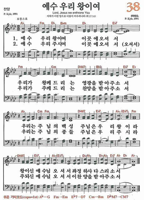 (새찬송가 38장) 예수 우리 왕이여<찬양+악보> 작성자靑野|작성시간15.11.30|조회수967 목록 댓글 0 글자크기 작게가 글자크기 크게가 클릭하면 커진다! 확 커진 플레이어로 감상하세요.공지사항으로 이동 닫기 종교 (새찬송가 38장) 예수 우리 왕이여 [CCM악보] 예수우리왕이여 [P. Kyle 작사, P. Kyle 작곡] 다음검색 현재 게시글 추가 기능 열기 북마크 공유하기 신고 센터로 신고 댓글 댓글 0 댓글쓰기 답글쓰기 댓글 리스트