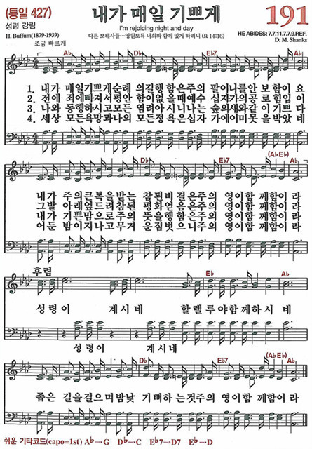 새찬송가 191장-내가 매일 기쁘게<찬양+악보> 작성자靑野|작성시간15.12.12|조회수2,068 목록 댓글 0 글자크기 작게가 글자크기 크게가 클릭하면 커진다! 확 커진 플레이어로 감상하세요.공지사항으로 이동 닫기 종교 새찬송가 191장-내가 매일 기쁘게 [CCM악보] 내가매일기쁘게 [H. Buffum 작사, D. M. Shanks 작곡] 다음검색 현재 게시글 추가 기능 열기 북마크 공유하기 신고 센터로 신고 댓글 댓글 0 댓글쓰기 답글쓰기 댓글 리스트