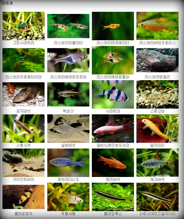 엔젤 휘시, 디스커스와 같은 아름다운 물고기가 대표적인 이 그룹은 크게 자라는 품종이 많고 모양이나 색깔이 풍부하며 기르기 시작한 역사도 오래 되어 초심자나 전문가를 막론하고 기르고 있다는 점이 다른 물고기와 다르다. 시판하는 것은 대부분 몸길이 2㎝전후의 어린 물고기이다. 그러나 이것이 기른지 1년이 지나면 놀랄 정도로 대형물고기로 변한다.