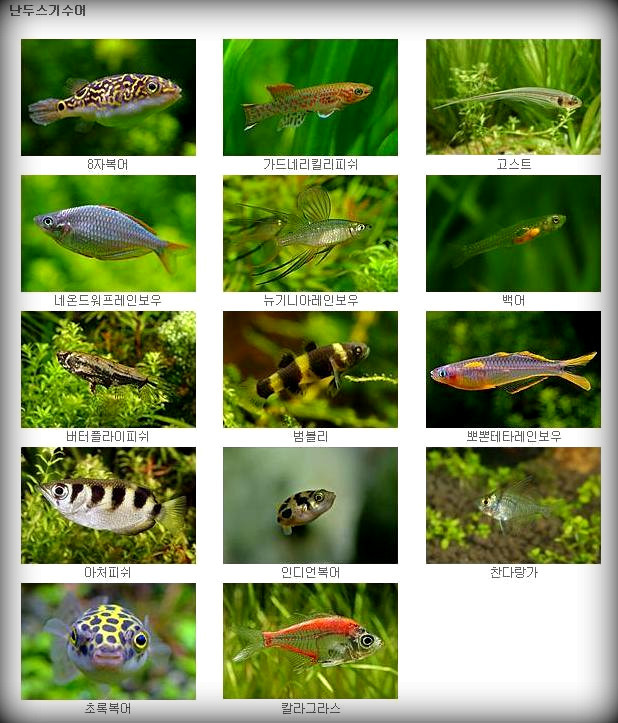 특징: 열대어 중 몸이 가장 투명하다. 유리와 같이 몸 전체가 투명하여 골격이 확실하게 보인다. 수질에는 다소 민감한 반응을 보이므로 주의를 요한다. 성질은 대단히 온화하기 때문에 활동성이 큰 타 어종과의 혼영은 피해야 한다. 빛은 너무 밝지 않도록 하고 큰 어항이 좋다. 수초를 많이 심은 어항에서는 어두운 곳에서 잘 나오지 않으므로 수초를 너무 많이 심지 않은 어항이 좋겠다. [자료출처:http://cafe.daum.net/PDM114/9W30/173?srchid=IIMQoR68100#Af-guppy.jpg]