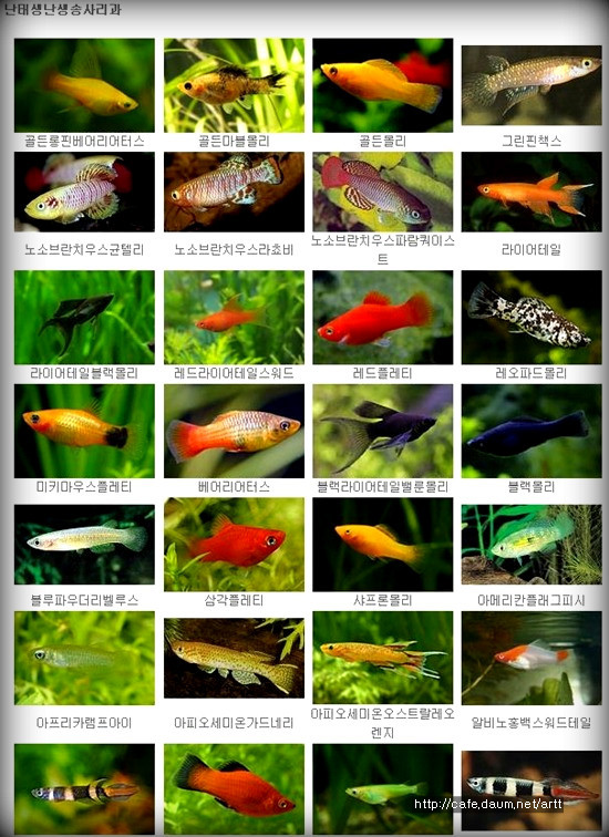 난태생 송사리과는 모체의 태내에서 수정된 알이 난황을 영양으로 그대로 태내에서 부화하여 어류의 형태를 갖추어 태어나는 난태생으로 아름다운 색깔을 가진 것이 많고 성질은 온순하며 사육관리도 손쉽고, 성장도 매우 빠른 편이다. 또한 번식도 용이하기 때문에 예로부터 많은 애어가의 사랑을 받으며 사육입문어로 인기가 높다.