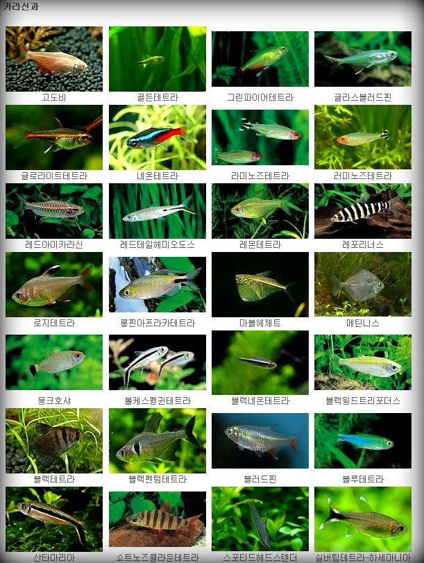 열대어 중에서 사육되고 있는 종류가 제일 많은 것이 카라신과이다. 이 과의 물고기는 비교적 소형의 것이 많고 색깔도 대단히 아름다워 관상가치가 높고 몸의 형태는 잉어과와 비슷하다. 잉어과와 다른점은 입에 이(齒)를 가지고 있고 잉어과의 물고기는 인후에 인두이(咽頭齒)를 가지고 있다. 또 하나 다른 것은 이 과의 대부분이 기름지느러미를 갖고 있다는 것이다. 이 지느러미는 작고 기조가 없이 등지느러미아 꼬리지느러미 사이의 등에 붙어 있어 다른 과와 구별이 쉽다.