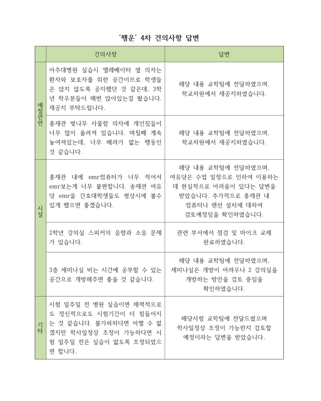 2025년 4차 건의사항 답변입니다. 작성자23 유서현|작성시간25.11.18|조회수66 목록 댓글 0 글자크기 작게가 글자크기 크게가 '행운' 4차 건의사항 답변.pdf48.35KB 첨부파일첨부된 파일이 2개 있습니다. jpg 파일 resized_IMG_6502.jpg 다운로드 pdf 파일 '행운' 4차 건의사항 답변.pdf 다운로드 다음검색 현재 게시글 추가 기능 열기 북마크 공유하기 신고 센터로 신고 댓글 댓글 0 댓글쓰기 답글쓰기 댓글 리스트