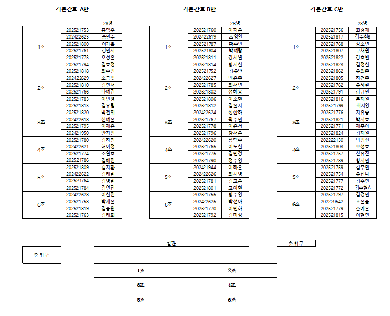 [기본간호학실습1] 분반 배정표(수정) 작성자양지숙(조교)|작성시간26.02.25|조회수727 목록 댓글 0 글자크기 작게가 글자크기 크게가 다음검색 현재 게시글 추가 기능 열기 북마크 공유하기 신고 센터로 신고 댓글 댓글 0 댓글쓰기 답글쓰기 댓글 리스트