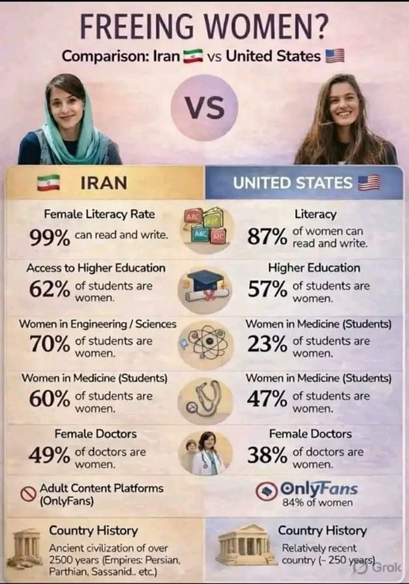 여성 대학 진학율 Access to Higher Education 이란 : 62%, 미국 : 57%