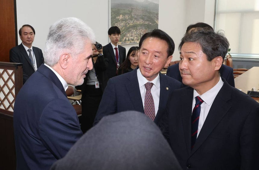 25일 오전 국회를 찾은 사이드 쿠제치 주한이란대사(왼쪽) 김석기 외교통일위원장(가운데)을 만난 모습. 뉴스1