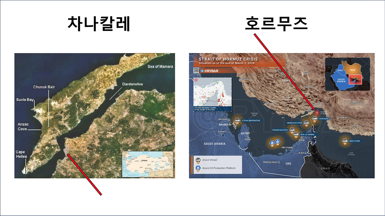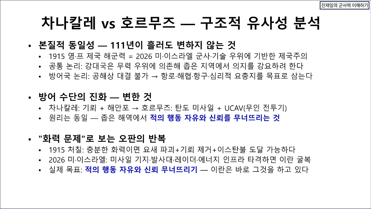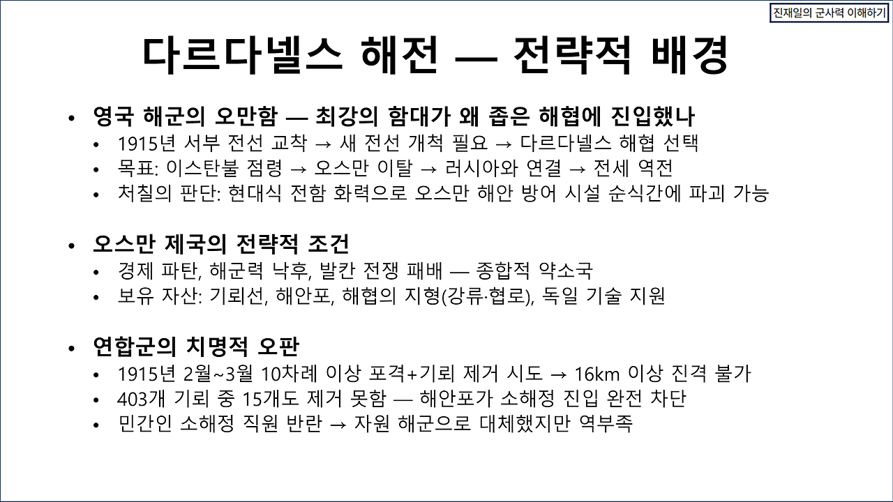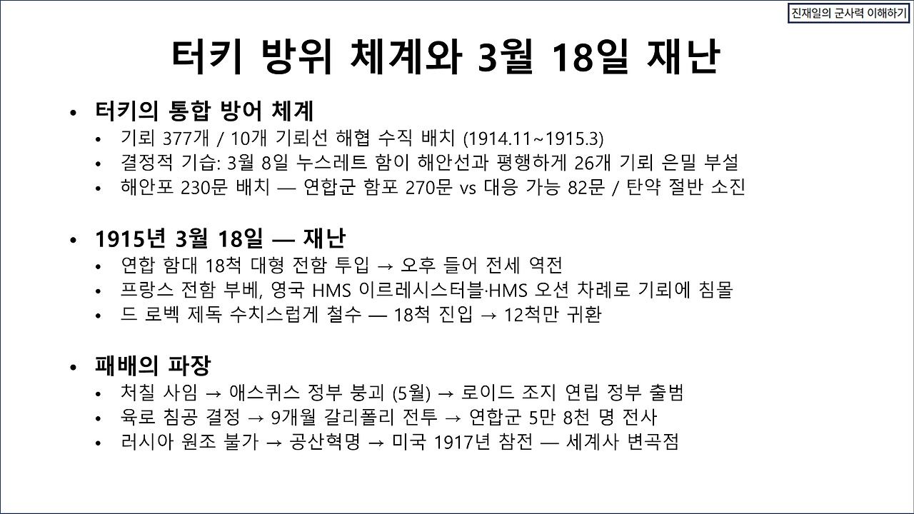 카르그 섬을 82사단으로 장악할 수 있다고 해도, 지속 작전에서 큰 문제가 생길 것이다. 이란의 포병 사거리 내에 존재하기 때문이다. 31 MEU와 또 다른 MEU를 파견하여 A-10와 F-15/B-1으로 GBU-72로 호르무즈 해협 절벽에 존재하는 이란의 동굴진지를 격파하는 방법으로 제압한다고 해도, 해협을 개방하는 작전을 지속하는 것이 매우 어렵다. 트럼프의 협상 제안 등은 지상전을 열기 위한 기만으로 해석하고, 일단 호르무즈 해협을 개방하는 작전을 수행하면 어떤 결과가 일어날 것인가에 대한 평가가 관심사항이다. 현대전의 수행방식이 매우 정교해진 탓에 과거의 전사와 비교할 바 못되지만, 유사한 사례인 갈리폴리 해전과 비교해 본다. 상세한 설명을 생략하고 대신 몇 장의 슬라이드로 간략화한다. 양해를 바란다.
