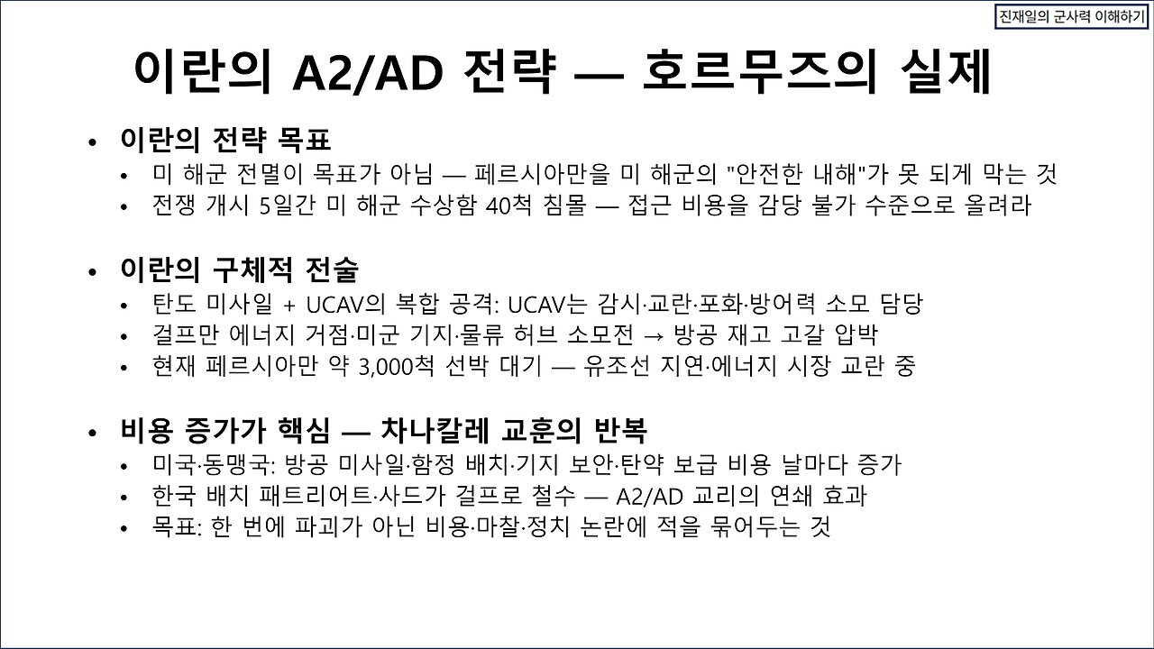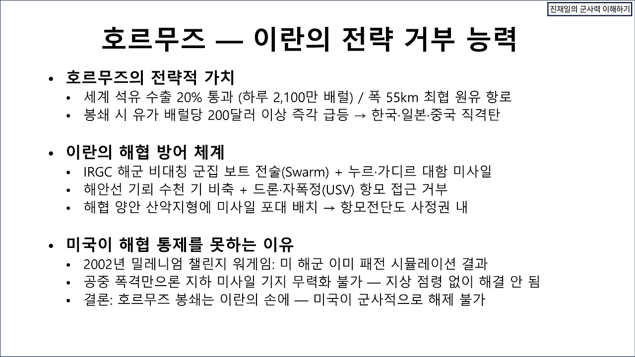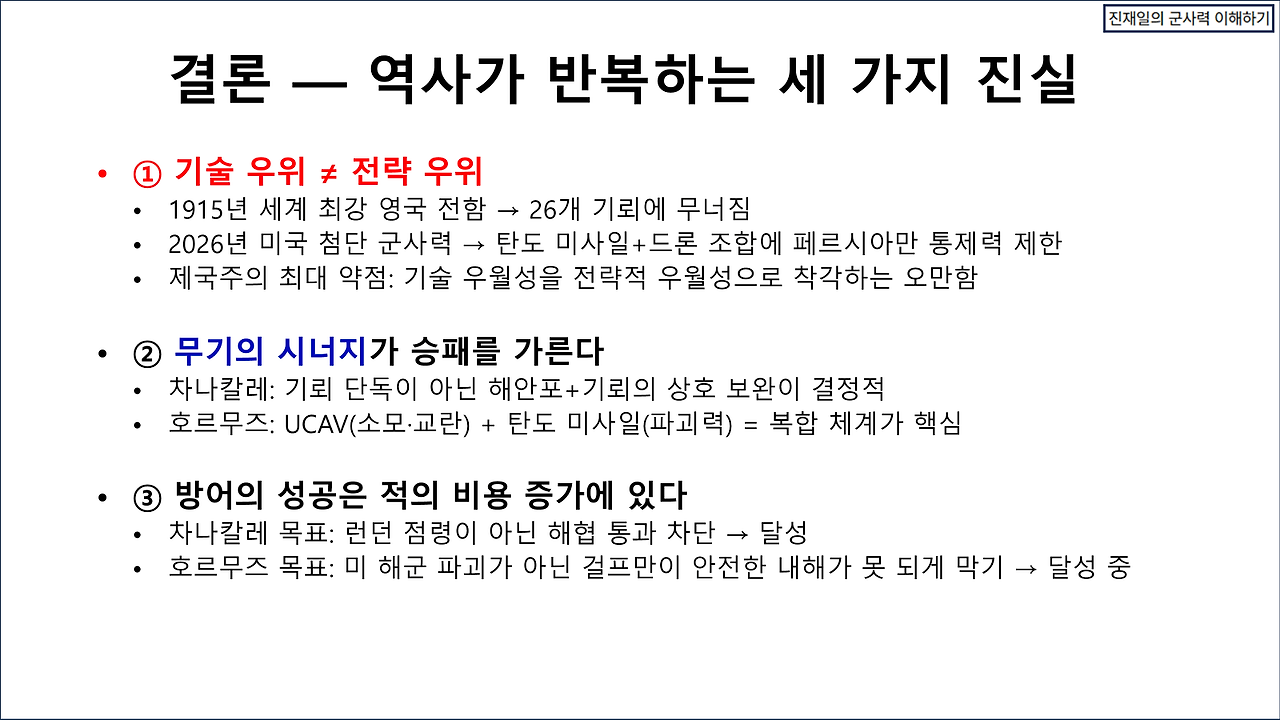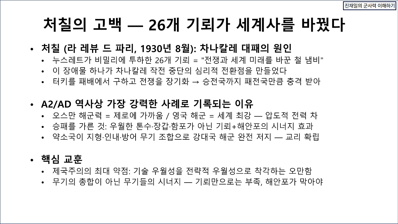 카르그 섬을 82사단으로 장악할 수 있다고 해도, 지속 작전에서 큰 문제가 생길 것이다. 이란의 포병 사거리 내에 존재하기 때문이다. 31 MEU와 또 다른 MEU를 파견하여 A-10와 F-15/B-1으로 GBU-72로 호르무즈 해협 절벽에 존재하는 이란의 동굴진지를 격파하는 방법으로 제압한다고 해도, 해협을 개방하는 작전을 지속하는 것이 매우 어렵다. 트럼프의 협상 제안 등은 지상전을 열기 위한 기만으로 해석하고, 일단 호르무즈 해협을 개방하는 작전을 수행하면 어떤 결과가 일어날 것인가에 대한 평가가 관심사항이다. 현대전의 수행방식이 매우 정교해진 탓에 과거의 전사와 비교할 바 못되지만, 유사한 사례인 갈리폴리 해전과 비교해 본다. 상세한 설명을 생략하고 대신 몇 장의 슬라이드로 간략화한다. 양해를 바란다.