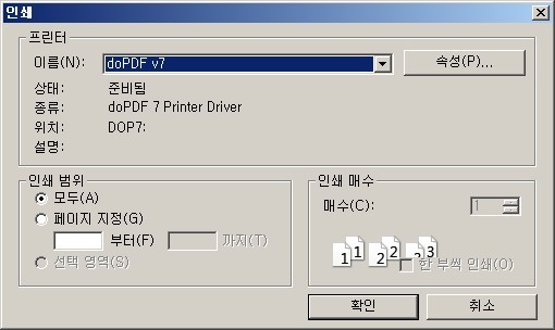 인쇄 버튼을 누릅니다. 프린터의 종류를 doPDF v7을 선택하고 확인을 눌러서 저장하면 됩니다.