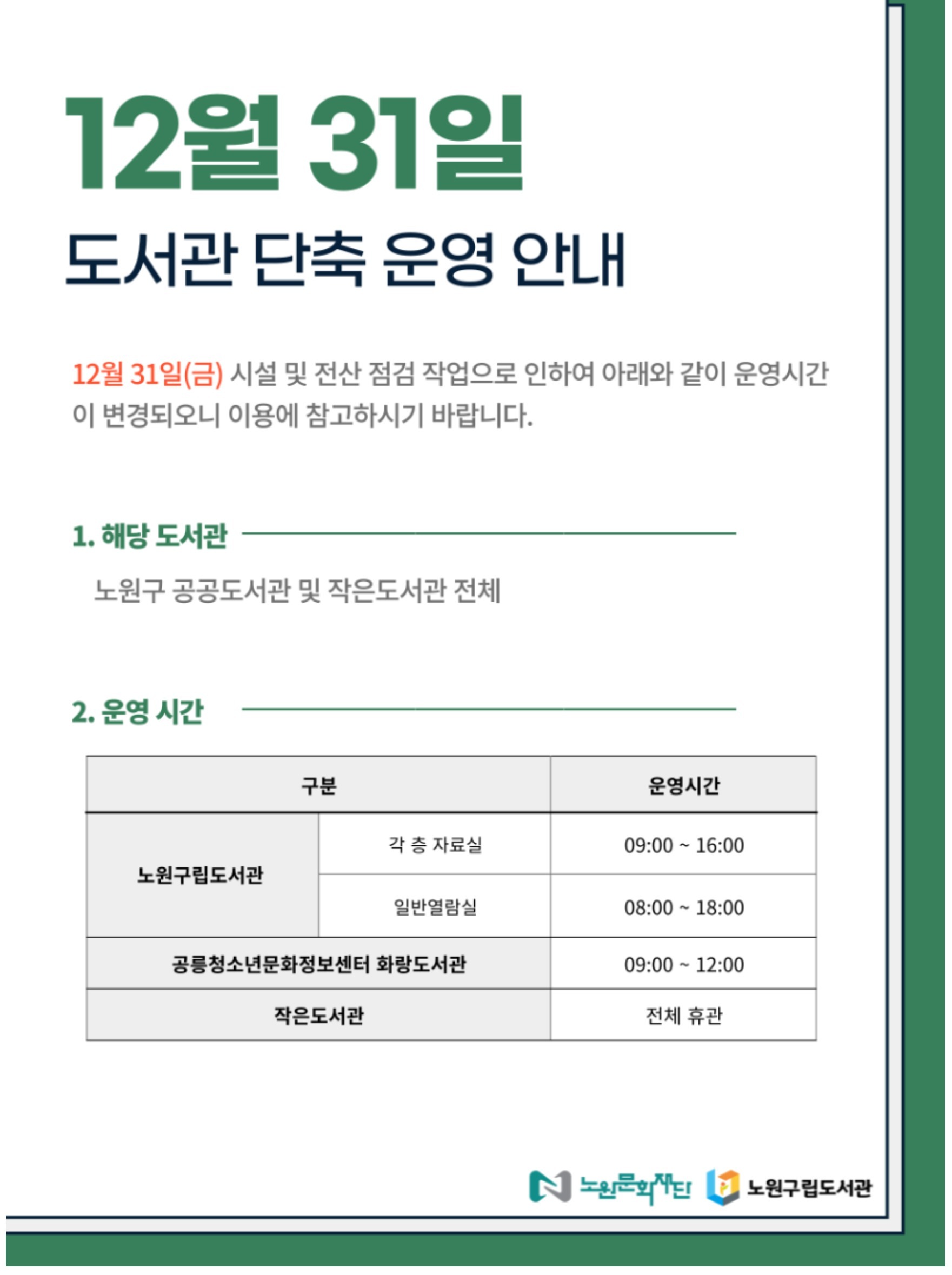 12월 31일(금) 시설및 전산 점검 작업으로 인하여 아래와 같이 운영시간이 변경되오니