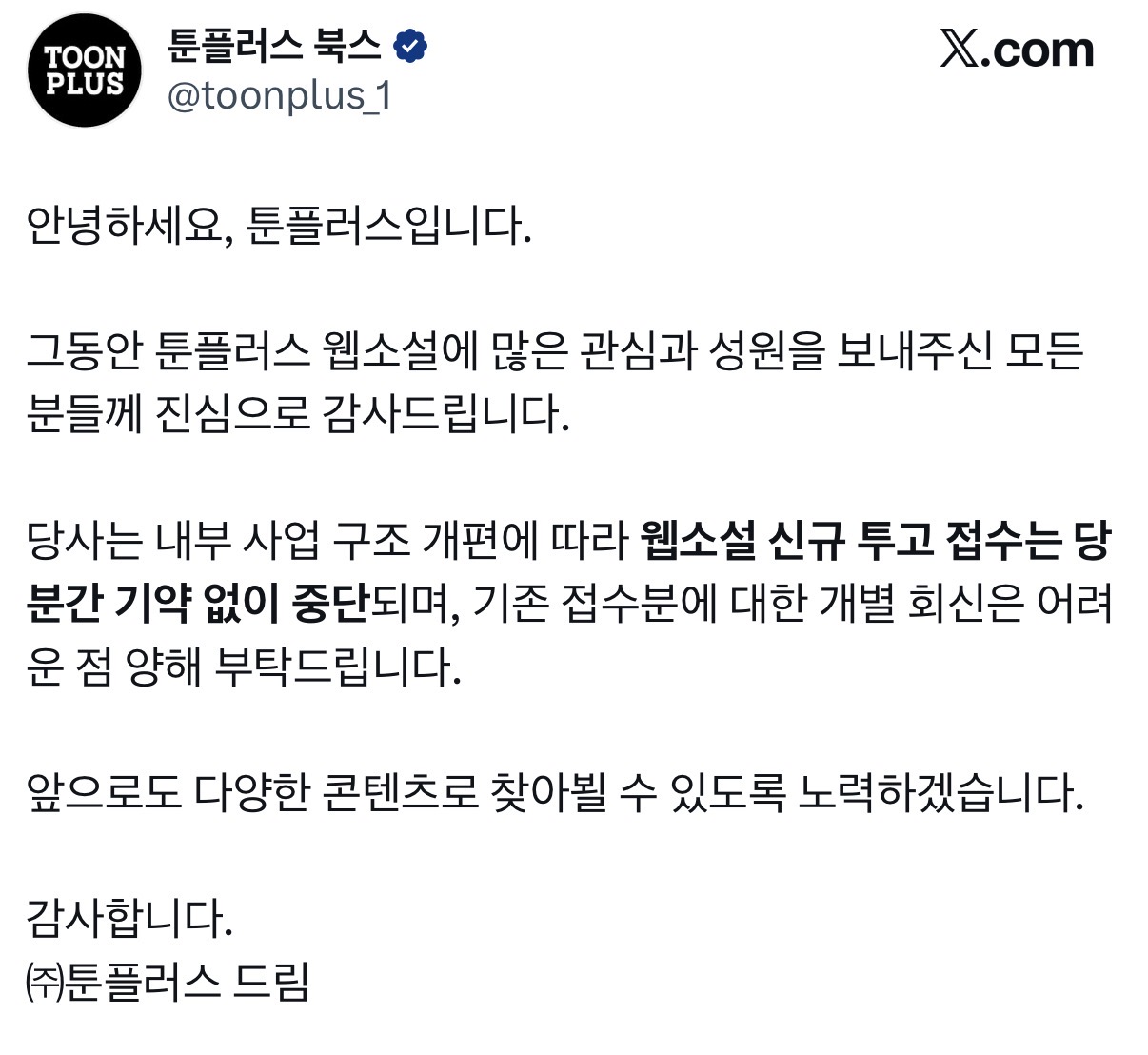 툰플러스 웹소 축소하나...? 작성자구글크롬|작성시간25.11.07|조회수836 목록 댓글 7 글자크기 작게가 글자크기 크게가 트위터에서 방금 봐서...... 다음검색 현재 게시글 추가 기능 열기 북마크 공유하기 신고 센터로 신고 댓글 댓글 7 댓글쓰기 답글쓰기 댓글 리스트 작성자오솔레미오 | 작성시간 25.11.07 툰플 망함 답댓글 작성자구글크롬 작성자 본인 여부 작성자 | 작성시간 25.11.07 헐........ 진짜 몰랐어 하나도..... 삭제된 댓글입니다. 답댓글 작성자구글크롬 작성자 본인 여부 작성자 | 작성시간 25.11.07 그랬구나ㅠㅠㅠㅠㅠㅠㅠ 알에스로 그나마 이관돼서 다행이네 해당 댓글은 작성자와 운영진만 볼 수 있습니다. 댓글 전체보기