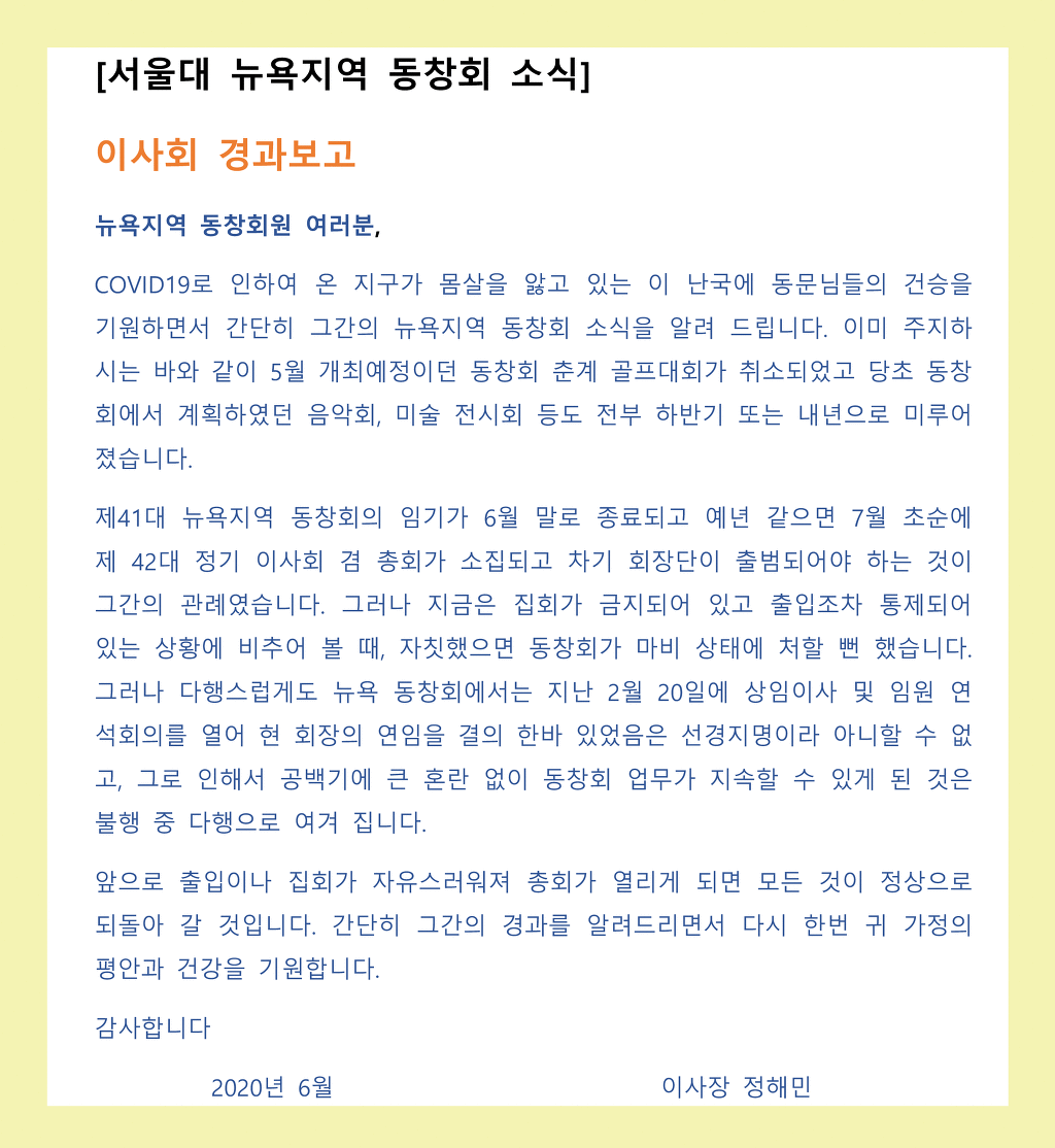서울대 뉴욕지역 동창회 소식: 이사회 보고 작성자정해민(뉴저지)|작성시간20.06.03|조회수140 목록 댓글 0 글자크기 작게가 글자크기 크게가 다음검색 현재 게시글 추가 기능 열기 북마크 공유하기 신고 센터로 신고 댓글 댓글 0 댓글쓰기 답글쓰기 댓글 리스트