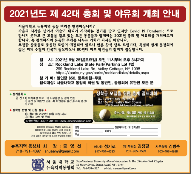 2021년도 제 42대 총회 및 야유회 개최 안내 작성자정해민(뉴저지)|작성시간21.09.22|조회수92 목록 댓글 0 글자크기 작게가 글자크기 크게가 다음검색 현재 게시글 추가 기능 열기 북마크 공유하기 신고 센터로 신고 댓글 댓글 0 댓글쓰기 답글쓰기 댓글 리스트