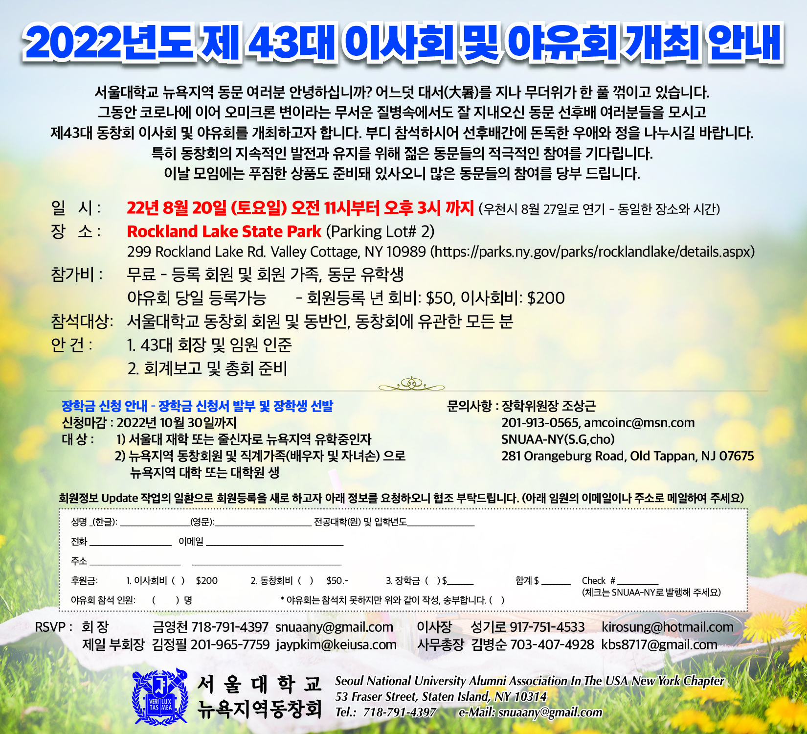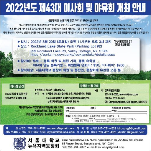 2022년도 제43대 이사회 및 야유회 개최 안내 작성자정해민(뉴저지)|작성시간22.08.07|조회수120 목록 댓글 0 글자크기 작게가 글자크기 크게가 동문님들의 많은 참석을 바랍니다. 참석여부를 알려주시면 준비에 도움이 되겠습니다. 감사합니다.중앙일보 광고 한국일보 광고 다음검색 현재 게시글 추가 기능 열기 북마크 공유하기 신고 센터로 신고 댓글 댓글 0 댓글쓰기 답글쓰기 댓글 리스트