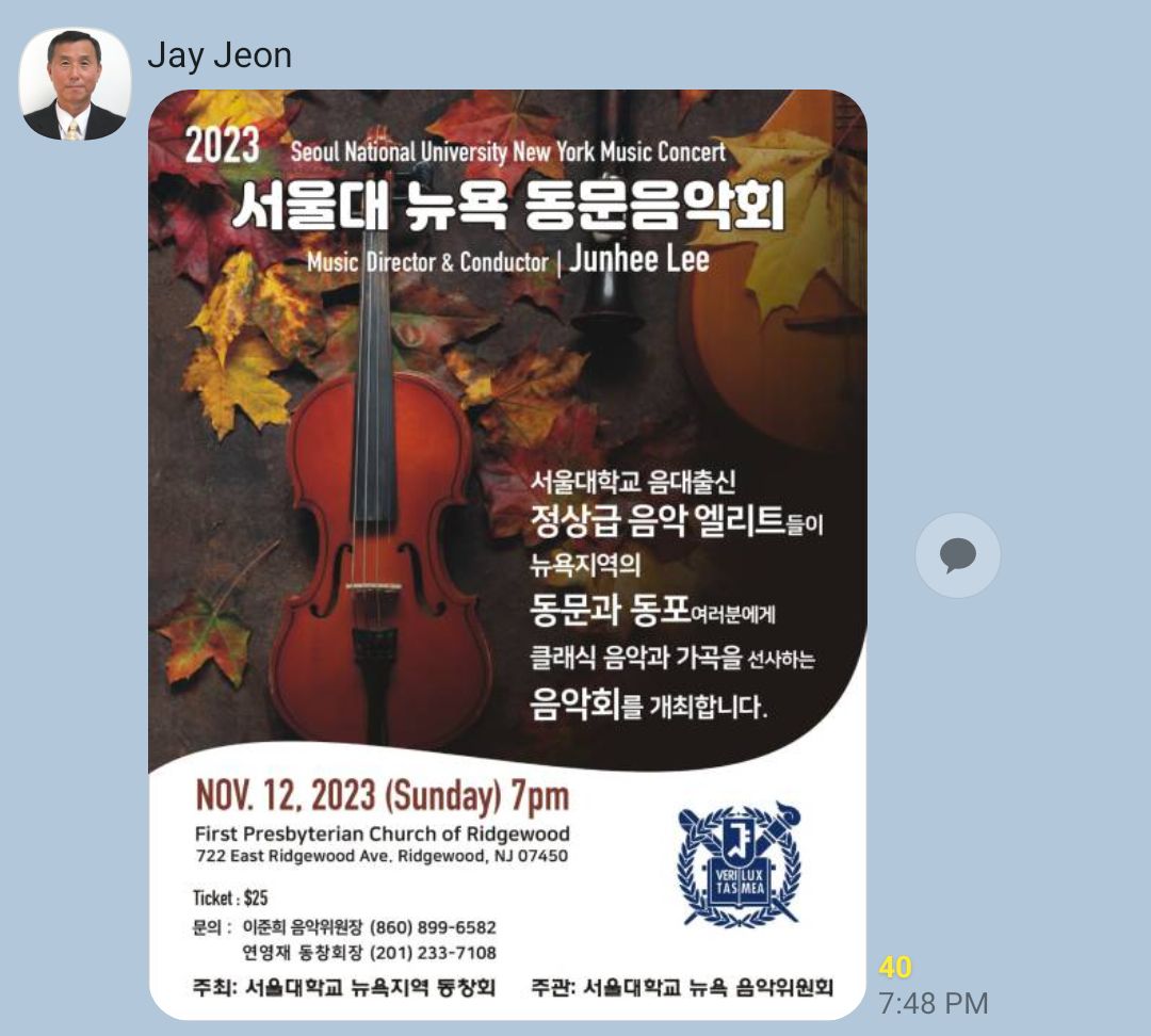 서울대 뉴욕 동문음악회 작성자우규환(뉴저지)|작성시간23.10.19|조회수76 목록 댓글 0 글자크기 작게가 글자크기 크게가 다음검색 현재 게시글 추가 기능 열기 북마크 공유하기 신고 센터로 신고 댓글 댓글 0 댓글쓰기 답글쓰기 댓글 리스트