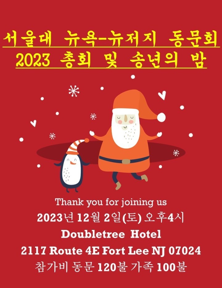 서울대 뉴욕-뉴저지 동문회 2023 총회및 송년회 작성자우규환(뉴저지)|작성시간23.11.27|조회수156 목록 댓글 0 글자크기 작게가 글자크기 크게가 다음검색 현재 게시글 추가 기능 열기 북마크 공유하기 신고 센터로 신고 댓글 댓글 0 댓글쓰기 답글쓰기 댓글 리스트