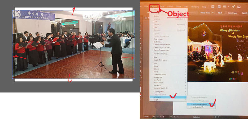 사진 가운데를 click해서 선택한후 menu bar의 "Object" 를 drop down하여 Artboards→ Fit to art work bounds 를 click 하면 완성.