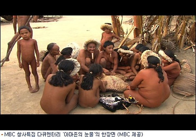 아마존의 눈물은 MBC가 총제작비 15억원, 제작기간 250일을 투입해 만든 다큐 걸작이라 할 수 있을 것 같습니다. 지난 북극의 눈물에 이어 지구의 눈물 시리즈 이기도 합니다. 이번 '마지막 원시의 땅'은 아마존 지역에 사는 원시부족 조에족 과 와우라족이 등장했습니다. 조에족은 1987년 이후 이번에 MBC가 처음으로 촬영했다 합니다. 조에족은 브라질 북부 파라주의 아마존 밀림 속에서 문명세계 와 접촉하지 않은 채 살아가고 있는데 남자와 여자 모두 순수 원시부족 전통생활 방식 자연 그대로 옷 하나 걸치지 않고 완전 알몸으로 생활하고 있었습니다.