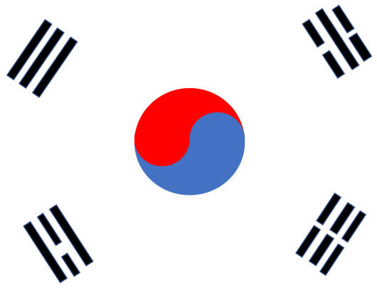 워드를 열어 새로 시작하기를 눌러서 하얀 보드가 컴퓨터에 뜨면 태극마크를 만들기 시작 한다. 맨위의 메뉴 바에서 insert를 클릭하여 shape를 눌러 동그라미의 사분의 일이 잘려나간 모양을 선택하여 마우스를 화면에 클릭하면 그 모양이 뜬다. 그 모양을 클릭하면 하얀 점과 노란 점이 뜨면 노란 점을 끌어당겨 모양을 반원으로 만들고 그 원에 마우스를 대고 control을 눌러 반원을 옆에 하나 더 만들고 반원1(첫번째 만든 반원)에 대고 오른쪽 클릭하여 Fill(물감통 모양)을 눌러 블루 색으로 만들고 반원2(두 번째 만든 반원)에 오른쪽 클릭하여 Fill에 가서 빨간 색으로 만든다. 이제 서로 떨어져 있는 반원 둘을 붙혀 원으로 만든다. 반원 1을 밑으로 가게 하고 반원2를 클릭하면 활성화되어 하얀 점이 나타나면 돌리는 화살표를 클릭하여 잘 돌려서 끌어다가 반원1 위쪽에 가져다 놓으면 위에는 빨간색 반원 밑에는 BLUE 반원이 되어 원이 된다. 이제 insert->shape->동그라미 선택하여 빨간 반원 왼쪽끝에 갖다 놓고 적당한 태극마크 사이즈로 줄여 놓고,control을 눌러 똑같은 원을 블루색 반원 오른쪽에 가져다놓아 적당한 사이즈로 태극 마크 사이즈로 맞추고, 왼쪽 동그라미에 대고 오른쪽 마우스를 클릭하여 fill에서 red color를 선택하면 빨간 태극 마크가 되고, 오른쪽 조그만 동그라미에 대고 오른쪽 클릭하여 fill에서 blue color를 선택하여 blue 태극마크가 된다. 이제 만들어진 태극마크를 적당히 움직여서 예쁘게 모양을 내고 여러조각으로 이루어진 태극마크를 한 부분을 클릭하면 하얀 점이 생긴다. 그러면 control을 누르고 다른 부분도 눌러 조각마다 흰 점이 생기게 한다. 이것은 각 조각을 다 활성화시켜 group으로 만들기 위함이다. 이제 각 조각에 다 하얀 점이 생기면 오른쪽 클릭하여 group을 클릭하여 또 group을 누르면 된다. group화는 완성된 태극 마크나 검은 막대기를 적당한 위치로 옮기는데 반드시 필요하다. 만약, group화를 하지 않고 클릭하여 옮기는 것(위치 변경, 방향조정 등)을 시도하면 각 조각이 따로 따로 움직여서 혼란이 온다. 반드시 태극 마크, 검은 막대 완성 후에 group화 하여 움직이자! 이제 여러 조각으로 되었던 태극 마크가 한 조각으로 뭉쳐진 것이다. 지금 태극 무늬위의 검은 선을 지우기위해서 format을 맨위의 메뉴 바에서 클릭하여 shape outline의 오른쪽 삼각형을 눌러 no outline을 눌러 태극마크 위의 줄을 지운다. 이제 insert->shape->직사각형을 선택하여 태극 마크 왼 쪽 옆에 마우스를 대면 점이 생기면 막대기를 적당한 크기로 그리고 막대기 색은 오른쪽 클릭하여 fill에서 검은색을 선택하면 검은 막대기가 된다. 막대기를 클릭하여 control을 눌러 똑같은 모양의 막대기를 3개(긴 막대기) 만든다. 이 세개의 막대기를 적당한 간격으로 가지런히 놓이게 하고 막대기 하나를 클릭하여 하얀 점이 생기면 control을 눌르고, 다른 두 개의 막대기를 하나씩 클릭하여 세개의 막대기에 다 하얀 점이 생긴 뒤에 거기에 대고 오른쪽 클릭하여 group->group을 클릭하면 막대기 3개 밖으로 네모와 하얀 점이 생겨 막대기 3개가 group화 됨을 보여준다. 이제 둥그런 화살표를 움직여 막대기 세개의 방향을 조절하고 위치를 변경 가능하다. group으로 만든 뒤에 막대기 간의 간격등을 다시 고칠 때는 오른쪽 클릭하여 unggroup하여 막대기 하나씩 클릭하여 하얀 점이 생기면 하나를 따로 움직여서 고친다. 태극 마크의 왼쪽아래에 긴 막대기 2개와 작은 막대기 2개(긴 막대기를 만들어 눌러 가에 흰점이 생기면 잡아당겨 반으로 줄이면 된다.) 그리고,작은 막대기를 눌러 control을 누르며 밑에 작은 막대기를 더 만들면 2개가 된다. 그리고나서 긴 막대기2개, 작은 막대기를 control을 눌러 다 활성화 시킨 후에(막대기가에 흰 점이 생김) 오른쪽 클릭하여 group->group을 눌러 group화 하고(막대기 전체에 네모가 바깥으로 생긴다.) 이것 위에 동그란 화살표를 돌려서 막대기의 각도를 조절하고 전체 막대기의 위치를 변경한다. 마찬가지 방법으로 태극 마크 오른쪽 위엔 긴 막대기 하나 작은 막대기 4개를 그려 group화 하여 방향, 위치 조절하고 태극 마크 오른쪽 아래엔 작은 막대기6개를 그리고 group화 하여 방향, 위치 조절하여 완성하여 file->save as->browse->제목쓰고->desktop에 work document 또는 pdf로 태극기를 저장하고 포토 샵을 열어 데스크톱에서 PDF(태극기)를 가져다가 크기 조절하여 JPEG로 데스크톱에 저장하여 글쓰기로 가서 사진으로 올리면 된다. 참고로, VIEW에서 GRID, RULER를 마크하여 화면에 설치하여 좀 더 균형있는 태극기를 그릴릴 수 있다. |
