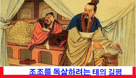 잠시후, 길평은 약을 식혀 가지고 다시 조조앞으로 가져갔다. 그리하여 약사발을 조조의 손에 닿는 곳에 내려놓고, 조조가 어서 마셔주기를 기다렸다. 두풍으로 괴로운 조조가 인상을 찡그리며 묻는다.
