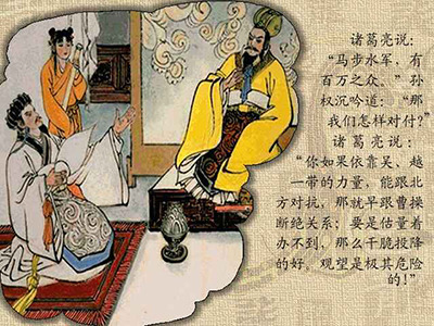 주유가 그 말을 듣고 공명을 반신반의하며 다시금 쳐다본다. 그러면서 잠시 생각하는 듯 하다가,