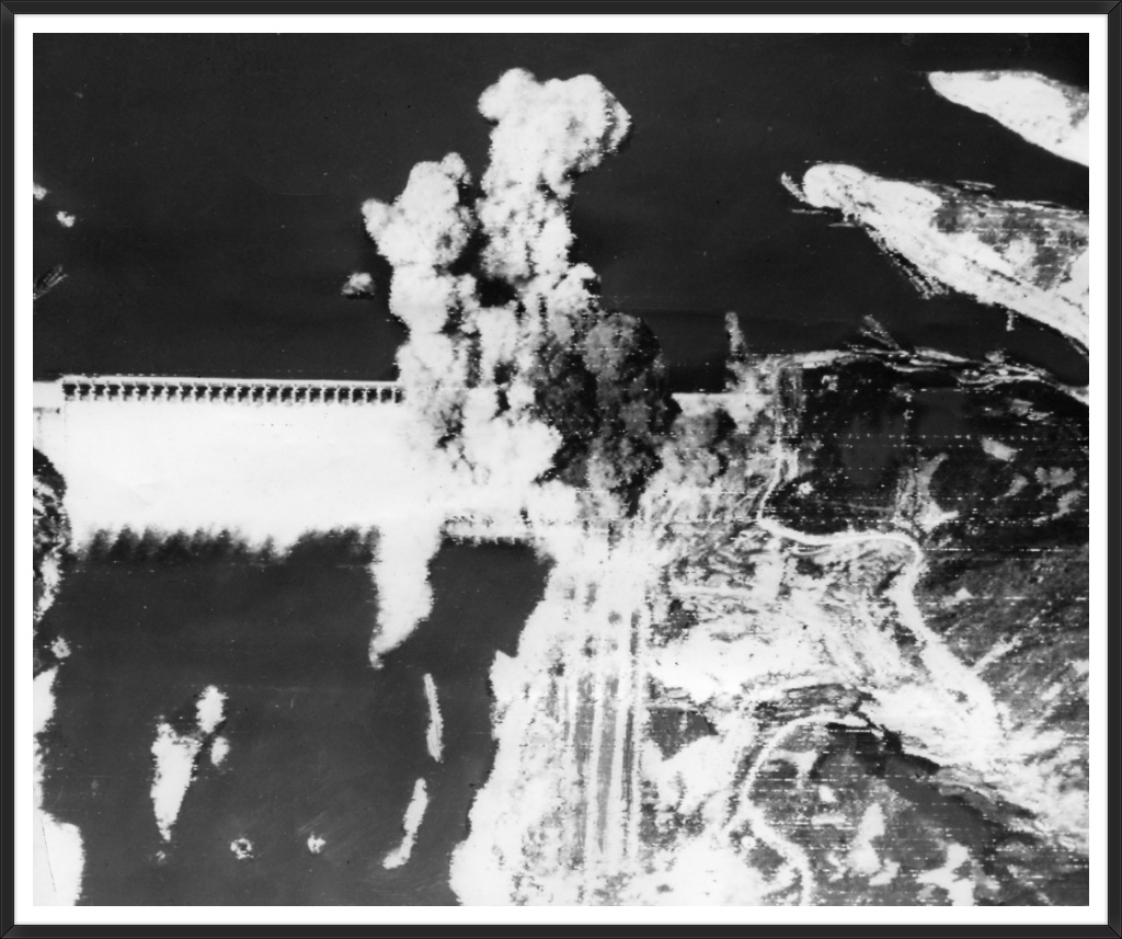 #169 북한 최대의 압록강 수력발전소가 공군과 해군의 합동 작전으로 총 4만 파운드의 폭탄을 투하하자 화염이 하늘로 치솟고있다. 해군 Skyraider 폭격기와 공군 F-84 폭격기 100여대가 나중에 공습작전에 참여함으로 수풍댐은 완전 파괴되었다. (1952년 6월 24일) The hydro-electric plant on Yalu River in North Korea erupts as it is hit with 40,000 pounds of bombs dropped by Navy Skyraiders in a joint Navy-Air Force attack on main power Plants in North Korea. Picture was taken in the early part of the attack as a short time later more than 100 Air Force F-84's bombs the switching yards in foreground. At left is the shoreline of Manchuria. (June 24, 1953) |