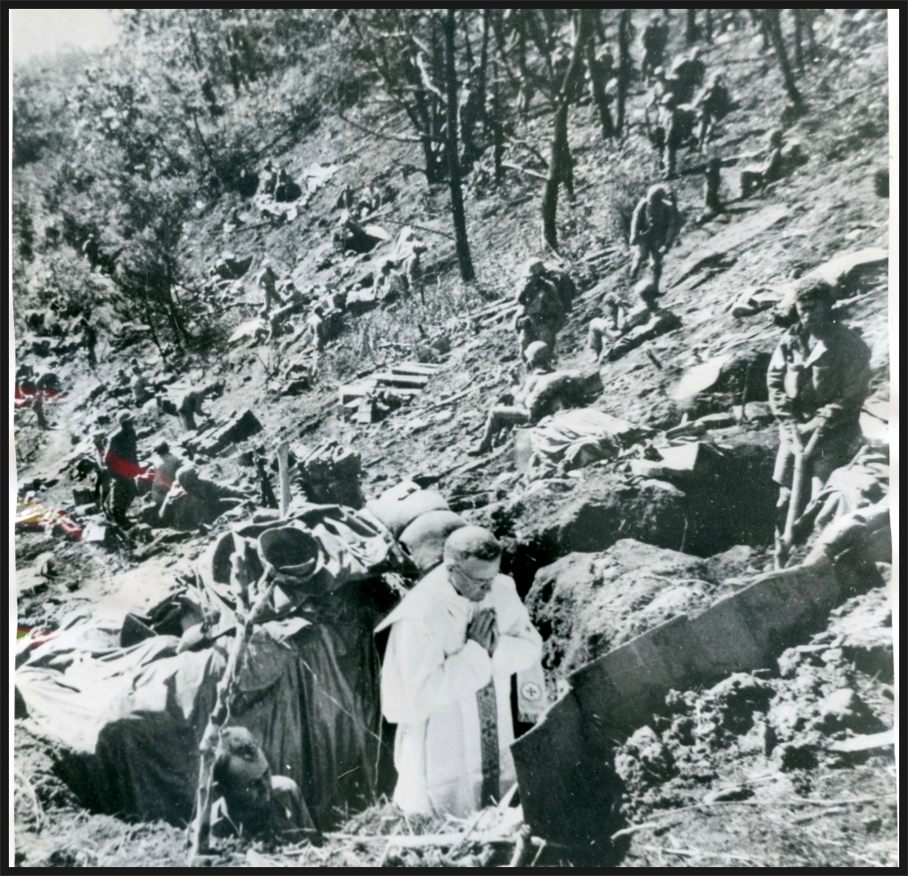 #253 "전선에서 적군의 포탄이 빗발치는 가운데도 장병들은 참호속에서 예배를 드리고있다. 산등성이에서 전쟁을 치루고 있는 상황에서도 예배를 전후해서 총알이 빗발치다가 예배 드리는 동안은 신기하게도 적군으로 부터 총성이 울리지 않았다. 산 밑에서 이곳을 확보하는데 까지 4시간이나 걸렸다." 당시 미사를 인도했던 전 해군 군 사제였던 James F. Follard 신부의 표현이다. (1951년 11월 1일) "Mass in a foxhole on the front lines-replacement moving up-men taking a breather after enemy shelling. Men attending mass all around the mountain after enemy. Men attending mass all around mountain slope-war must go on. Red shells came over before mass and after mass - none fell during mass. It took troops four hours to reach this spot from bottom of mountain." This picture shows Father James F. Follard, USN, former chaplain at Mare Island Naval Hospital, Vallego, Calif., in a foxhole in Korea. The above words are his. (Nov. 1, 1951) |