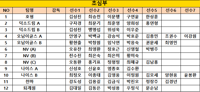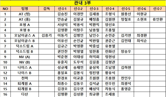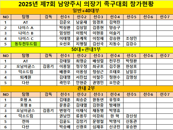2025년 제7회 남양주시 의장기 족구대회 참가현황 작성자남지수 [경기위원장]|작성시간25.10.20|조회수831 목록 댓글 2 글자크기 작게가 글자크기 크게가 조추첨일정 : 10월 23일 목요일 오후7시 나이스구장*각 팀의 선수분들께서는 유니폼 단일복장 착용 부탁드립니다* 다음검색 현재 게시글 추가 기능 열기 북마크 공유하기 신고 센터로 신고 댓글 댓글 2 댓글쓰기 답글쓰기 댓글 리스트 작성자남일우[협회장] | 작성시간 25.10.21 각클럽 감독님들 빠른선수명단 공지바랍니다 답댓글 작성자드림회장 권인찬 | 작성시간 25.10.21 남양주 시의장기 선수명단 입니다일반부+40대관내1부정상근.배광호.조태호.이용성.남일우관내2부 권남인.류용무.이강희.한혁.강신성관내3부A조유봉열.김규근.박충섭.박영환관내3부B조전화선.권영성.권인찬.임한홍.박형열 관내4부A조최문기.구자경.최훈영.양회성관내4부B조김성진.위성욱.맹명섭.이우준이상입니다 댓글 전체보기