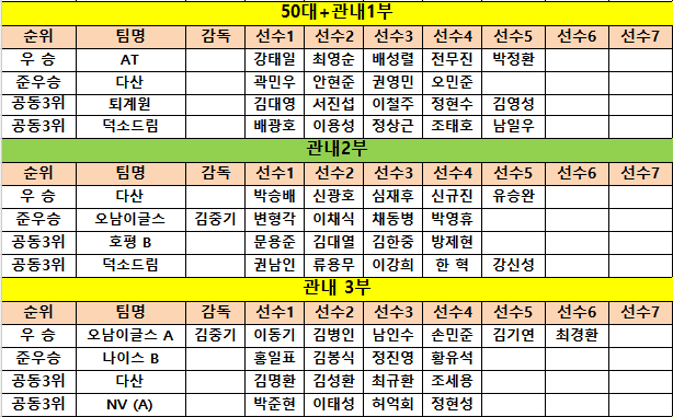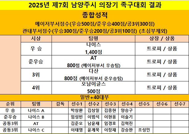 2025년 제7회 남양주시 의장기 족구대회 결과 작성자남지수 [경기위원장]|작성시간25.10.27|조회수256 목록 댓글 1 글자크기 작게가 글자크기 크게가 다음검색 현재 게시글 추가 기능 열기 북마크 공유하기 신고 센터로 신고 댓글 댓글 1 댓글쓰기 답글쓰기 댓글 리스트 작성자남일우[협회장] | 작성시간 25.10.27 전 클럽선수분들 수고들 많으셨습니다 댓글 전체보기