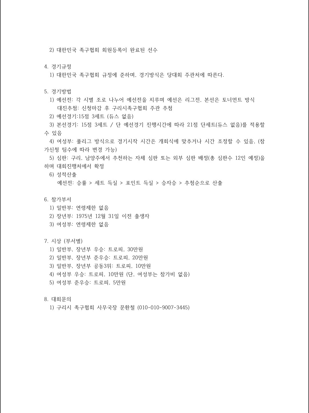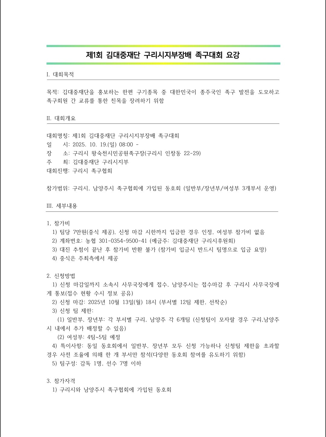제1회 김대중재단 구리시지회장배 족구대회요강 작성자황유석 [사무장]|작성시간25.09.23|조회수253 목록 댓글 0 글자크기 작게가 글자크기 크게가 다음검색 현재 게시글 추가 기능 열기 북마크 공유하기 신고 센터로 신고 댓글 댓글 0 댓글쓰기 답글쓰기 댓글 리스트