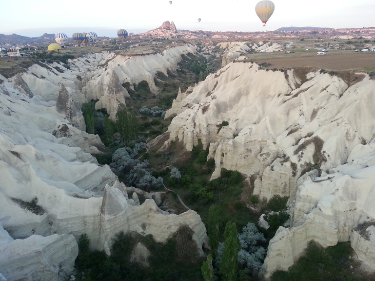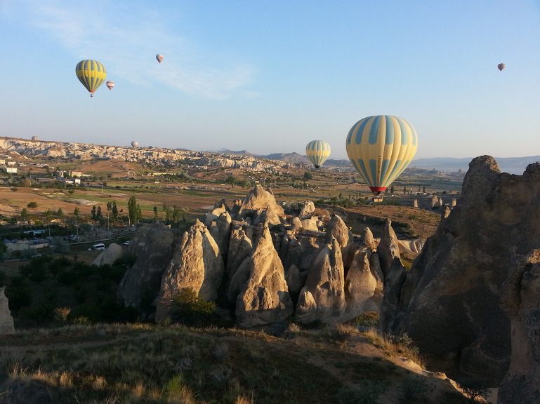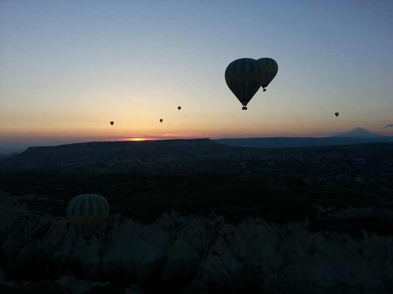 카파도키아 의 지평선에 떠오르는 일출광경과 계곡상공 을 날아 다녔음.