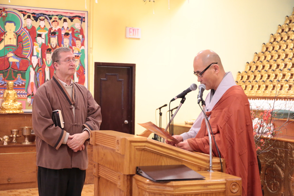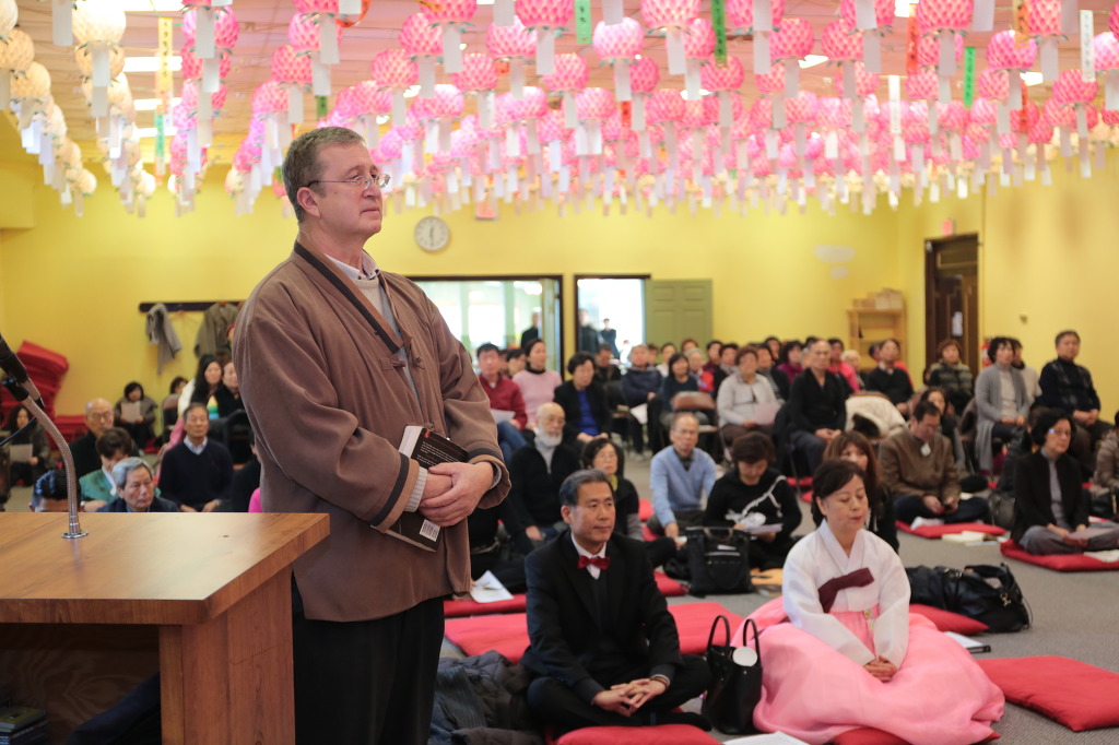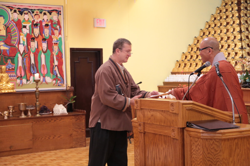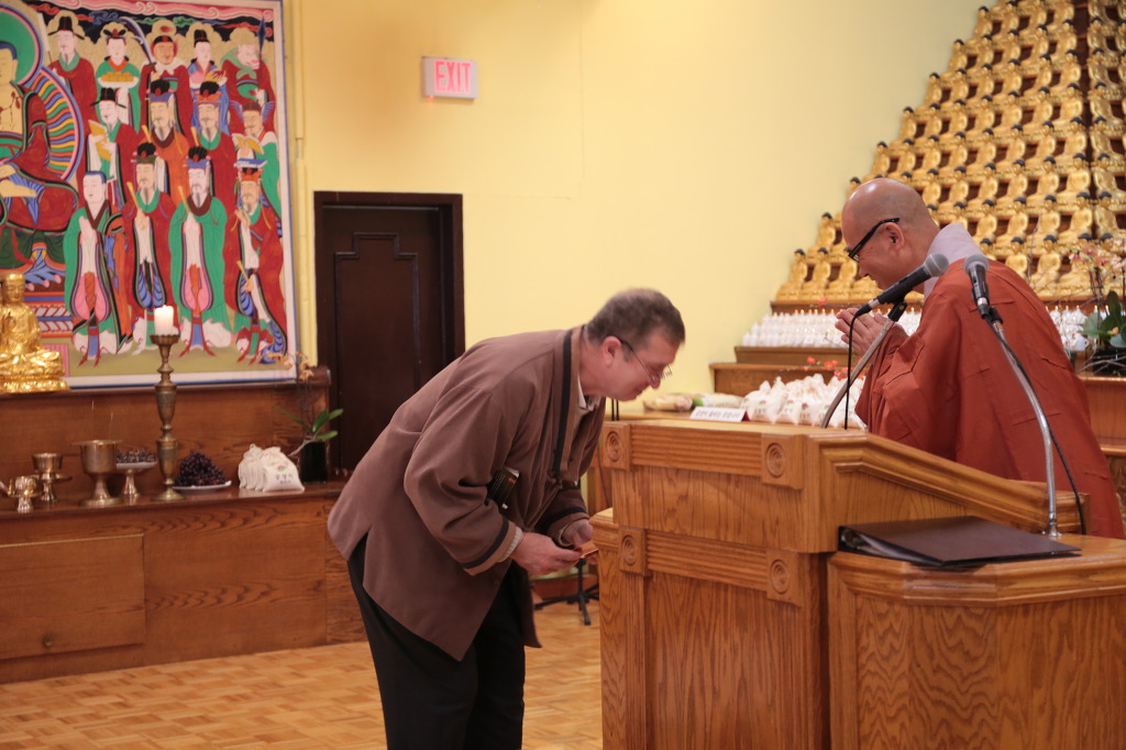 미국분 이셔서 한국식 법회에 소통이 자유롭지 않으심에도 불구하시고 거의 빠짐없이 법회에 동참하시고 찬불가 또한 사랑해 주시는 데니스 거사님께서 드디어 주지 스님으로부터 불명을 수여 받으셨습니다