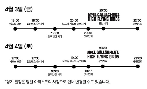 각 날짜별 공연 입장, 공연 시작 및 종료 예정 시각은 위 그림을 참고해주시기 바랍니다.