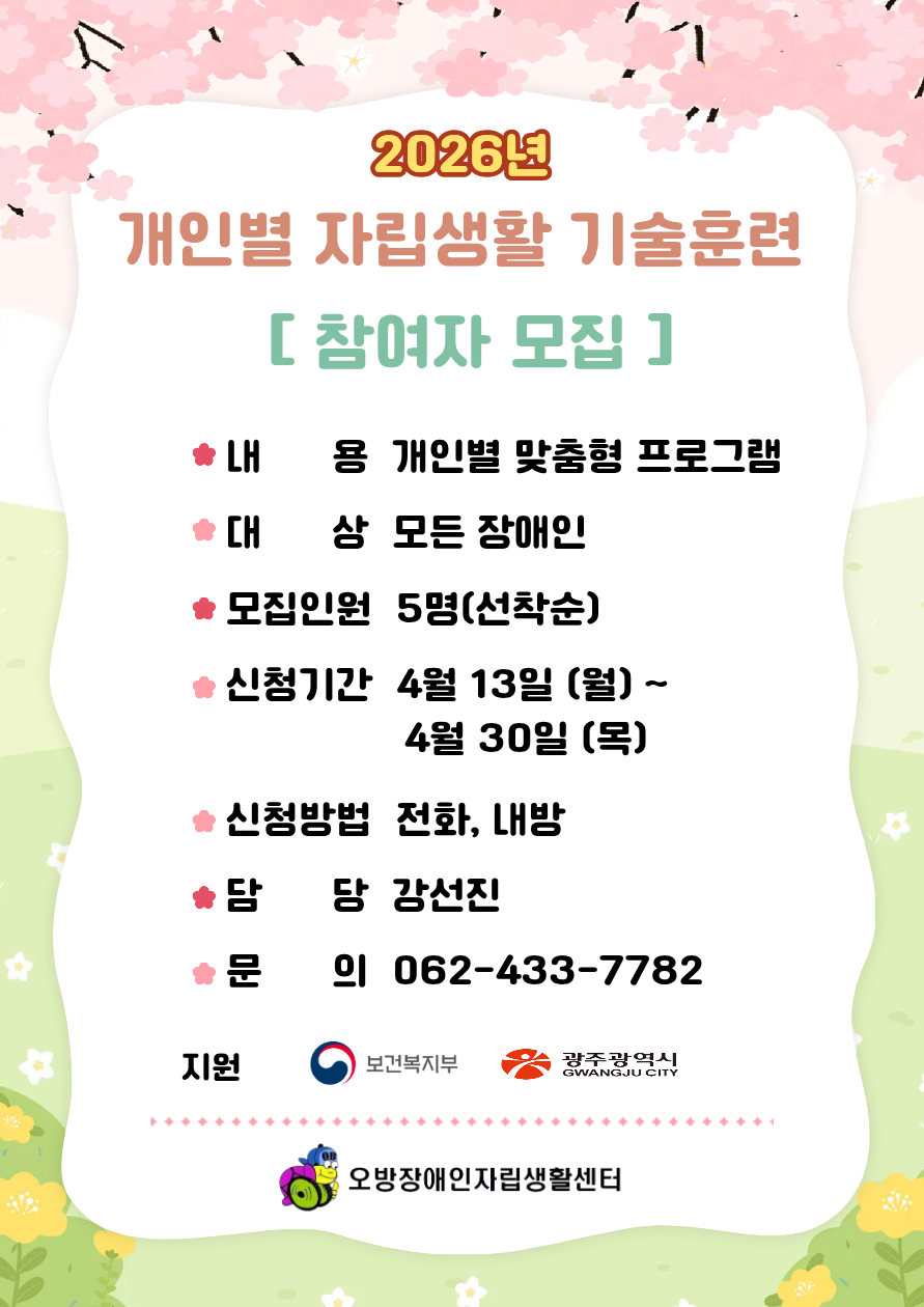 | [참여자 모집] 내 용 : 개인별 맞춤형 프로그램 대 상 : 모든 장애인(지역사회 내) 모집인원 : 5명(선착순) 모집기간 : 3월 13일(월) ~ 4/30(목) 신청방법 : 전화, 내방 담 당 : 강선진 문 의 : 062-433-7782 |