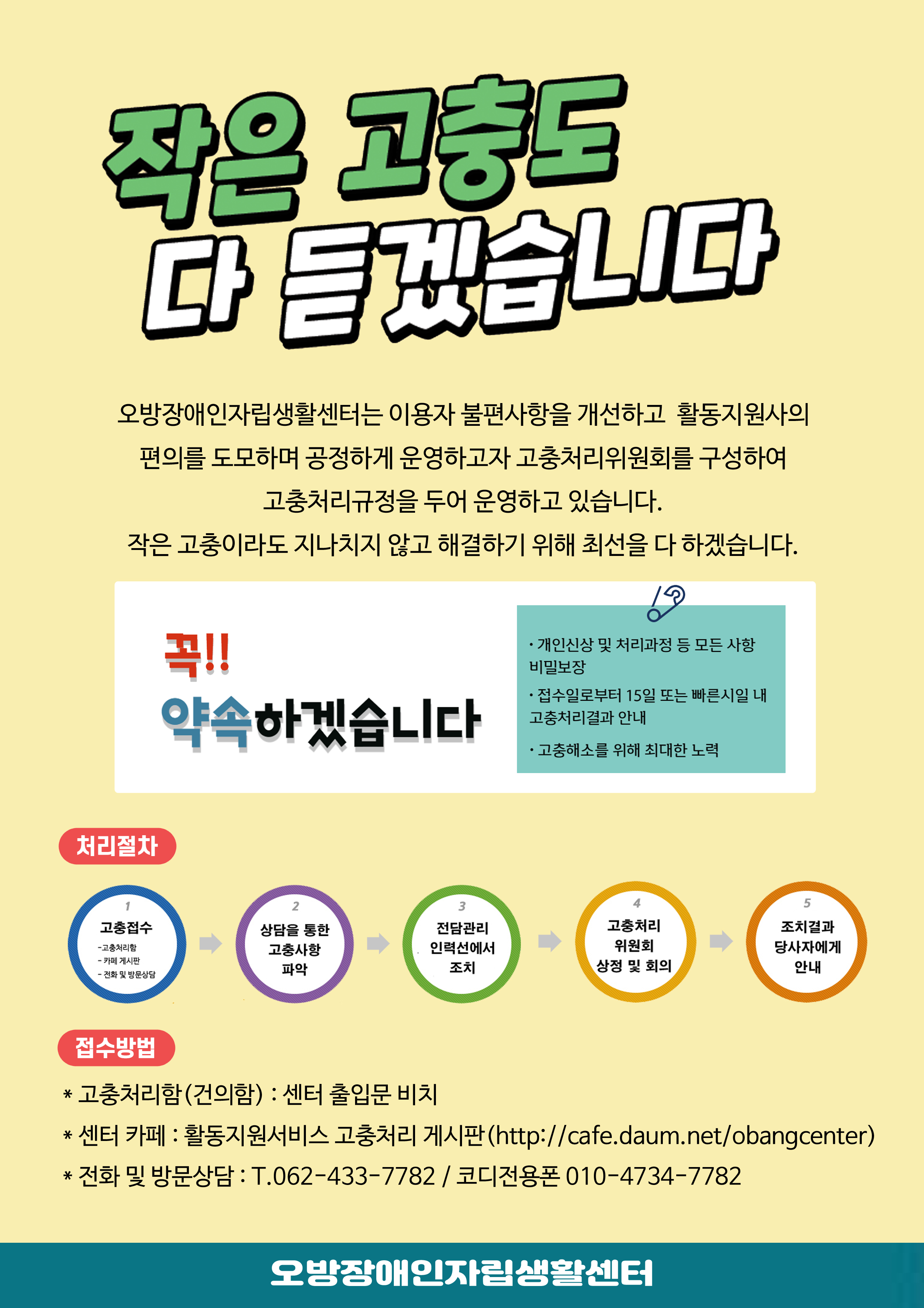 오방장애인자립생활센터는 신속하고 정확한 고충 처리 해결을 위하여 노력하겠습니다.