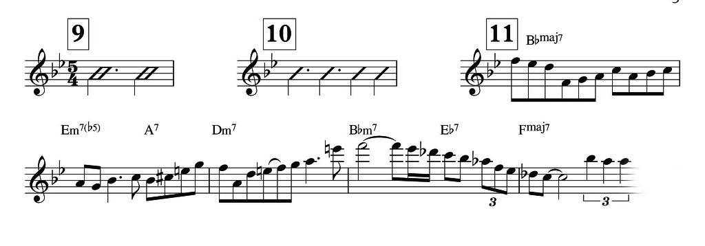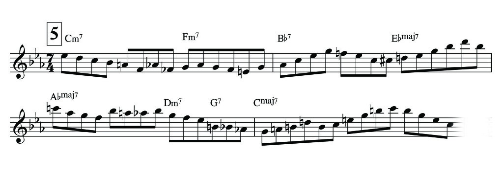 아래의 연주는 Peter Bernstein의 5/4박자 연주 'Stella By Starlight'중 일부 입니다. 3박+2박 의 형태를 취하고 있는 프레이즈로서 처음 5박연주를 시도할 때는 이와같은 틀로 연주해보는것이 이해가 빠를 수 있습니다. 그러나, 그렇다 치더라도 필자의 경우 위에서 연습한 고지식한 8분음표, 3연음 연습을 계속하라고 권하고 싶습니다.