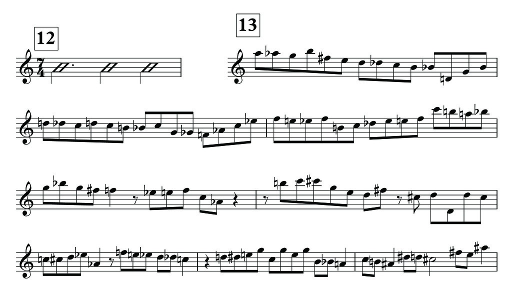 아래연주 역시 3박+2박+2박의 형태로 이루어진 7/4박 연주입니다. 물론 재즈적인, 비밥적인 프레이즈를 한껏 집어 넣은 것이구요.