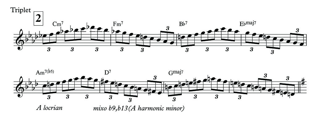그러나 위의 연습은 스케일연습보다는 3/4박의 느낌을 습득하는 연습입니다. 꼭 많은 스텐다드 곡들을 이 방식으로 메트로놈과 함께 몇 주에 거쳐 연습하길 권합니다. 그 다음은 아래와 같이 3연음으로 연습합니다. 아마도 100~140 정도의 템포에서 3연음과 16음표를 쓰는것은 슬로우, 미디엄 스윙에서 너무나 필요하기 때문에 꼭 테크닉적으로 해결해야 할 과제 중 하나이구요. 이와 같은 연습은 조 페스의 Django, 울프 베케니우스Ulf Wakenius 의 You Look Good To Me(youtube버전)등에서 연주 뉘앙스를 모방하는것도 좋다고 생각합니다.