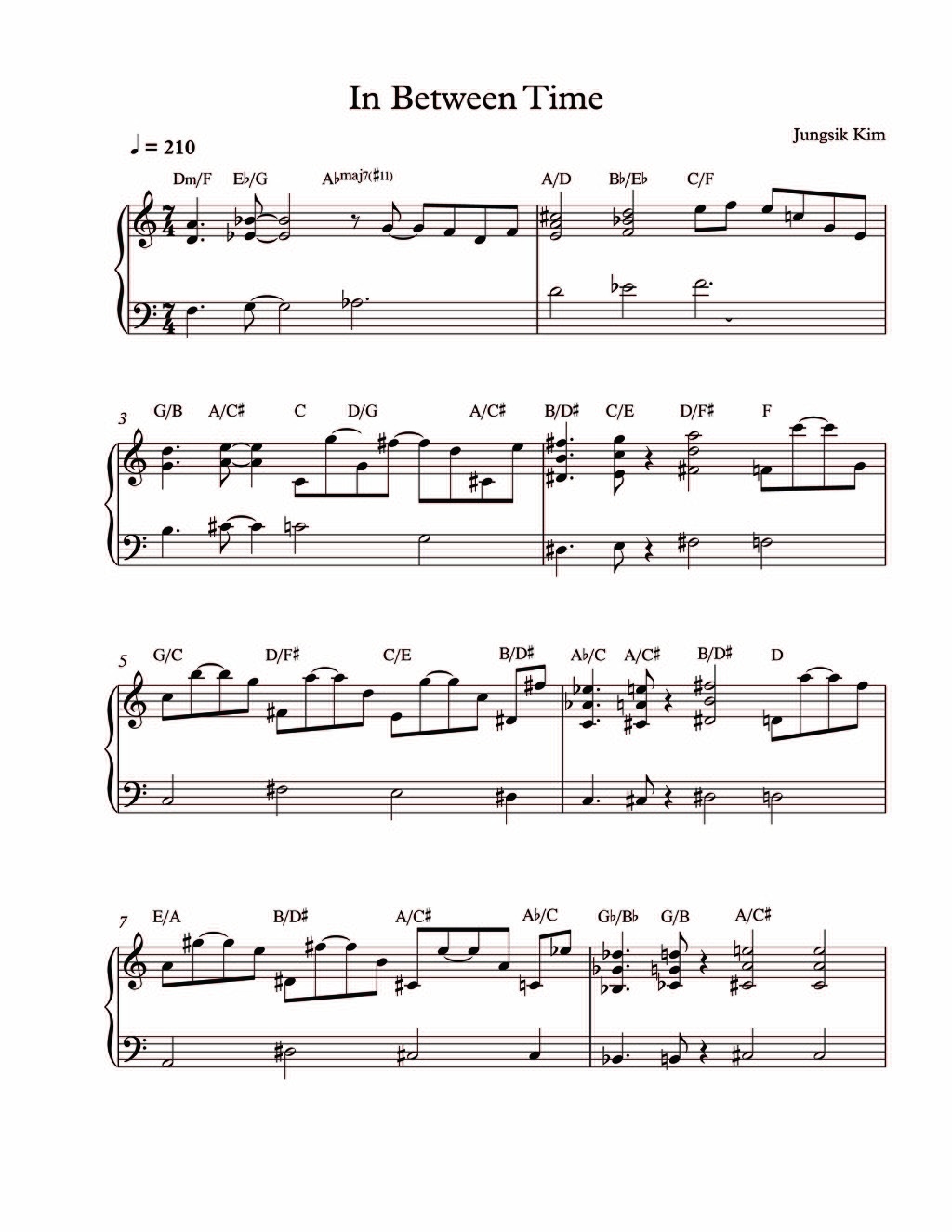 아래의 곡은 제가 쓴 7박곡입니다. 헤드와는 달리 솔로체인지를 블루스폼으로하여 라이브연주시 서로 부담없도록 하였습니다. 왜냐하면 헤드가 너무 힘들어서...ㅎ 이렇듯, 5,7박 연습은 아주 쉬운 체인지로 연습하는게 좋습니다. Autunn Leves나 블루스 등... 공연전 리허설했던 영상 함께 올립니다