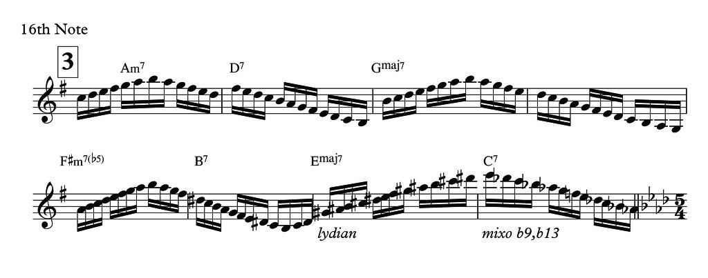 위와 같은 3연음은 3박 느낌을 습득하는데 아주 큰 도움을 주게 됩니다. 물론 아래 악보[3]의 16th연주도 마찬가지구요 그러나 앞서 언급했듯이 록음악에서의 16분음표를 연주하는것과는 상당한 피킹뉘앙스에 차이가 있으니 꼭 George Benson, Pat Martino 그리고 최근 연주자로는 Lage Lund, Jonathan Kriesberg, Gilad Hekselman등의 미디엄스윙 연주를 숙지하시면 좋을거 같습니다.