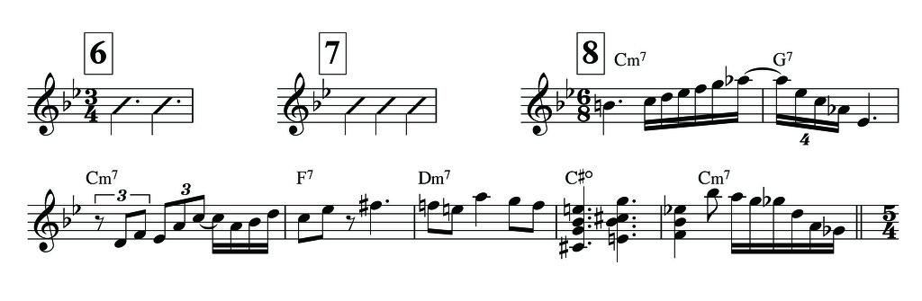 이제 약간 디테일한 리듬의 활용에 대해 말씀드려보자면 악보[6]의 점4분음표(Dotted Quarter)는 3/4박자에서 아주 크게 사용되는 박자입니다. 여기서 3박 4연음, 또 4/4박자와의 메트릭모듈레이션이 행해 지기도 합니다. 이것 역시 빌 에반스를 들으면 가장 선명하게 느끼 실 수 있으리라 생각합니다. 지금은 그의 후예들인 허비 행콕, 칙 코리아 등 대가와 그 후배 뮤지션들에 의해 너무도 흔한 것이 되어버린 느낌이지만 당시 베이시스트 스캇 라파로와의 신기에 가까운 3박 인터플레이는 음악에 있어서 폴리리듬, 특히 3박과 4박을 경계없이 넘나들며 만드는 리듬적인 유희가 얼마나 아름답고 재미있는것인지 느끼게 해 줍니다. 아래의 악보는 빌 에반스와 스캇 라파로가 연주한 Someday My Prince Will Come의 솔로 중 일부분 입니다. 여기에 나타나있듯이 리듬[6]과 [7]이 계속 교차하면 연주되고 있음을 알 수 있습니다.