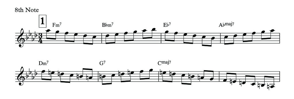 그러므로 먼저 3/4박의 확실한 연습을 강력히 추천하는 바입니다. 우선 4박 만큼 3박이 자유로워 질 때까지 연습해야하는데 처음에는 정말 힘들게 느껴지고 플레이어롱 파일에 연습하거나 잼을 하게되면 몇 번이고 마디의 첫 박을 잊어버리게 되는데 그 과정을 꼭 극복해야 한다는 말씀을 드리고 싶습니다. 그 첫번째 연습으로 아래 악보의 [1]과 같은 스케일 연습을 메트로놈(3/4)에 맞춰서 어느 스텐다드 곡이던지 연습하길 권합니다. 여기 코드의 3음에서 시작하는것이 유용하다 생각하여 적어 놓았으나 본인이 생각하는 스케일, 코드톤 연습을 적용해서 하시면 됩니다. 만약 스스로 생각할 때 스케일 연주에 무리가 있다고 생각한다면 바로 이 연습을 접고 다이어토닉스케일과 세컨더리도미넌트를 비롯한 각종 도미넌트에 쓰이는 스케일을 지판에서 자유롭게 연주 할 수 있도록 해야할 것입니다.